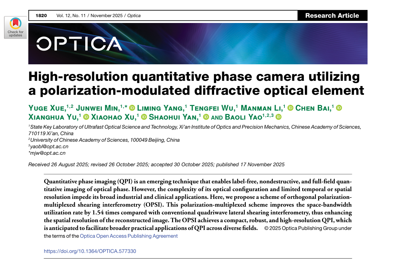 近日,超快光科學(xué)與技術(shù)全國(guó)重點(diǎn)實(shí)驗(yàn)室姚保利研究員團(tuán)隊(duì)在定量相位成像(Quantitative Phase Imaging, QPI)領(lǐng)域取得了重要進(jìn)展,相關(guān)研究成果發(fā)表于光學(xué)領(lǐng)域國(guó)際著名期刊Optica。論文第一作者為中國(guó)科學(xué)院西安光機(jī)所2022級(jí)博士研究生薛雨閣,通訊作者為閔俊偉和姚保利研究員,西安光機(jī)所為第一完成單位及通訊單位。