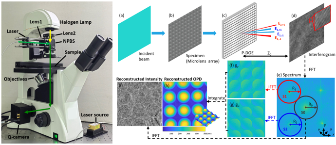 圖1. Q-camera用于顯微成像的實(shí)物裝置圖以及工作流程示意圖