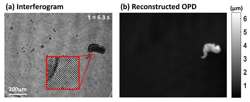 基于上述OPSI方法構(gòu)建集成化定量相位相機(jī)Q-camera,將空間帶寬利用率由39%提升至54%,顯著增強(qiáng)了系統(tǒng)的成像細(xì)節(jié)分辨能力。相機(jī)支持單次曝光實(shí)時(shí)成像,實(shí)驗(yàn)以30fps的幀頻展示了水中輪蟲的實(shí)時(shí)運(yùn)動(dòng)行為(如圖2所示)。此外,該技術(shù)兼容激光與低相干寬帶光源,并具有寬波段適用能力,使用寬帶照明光源(如鹵素?zé)舻龋┱彰骺梢燥@著提升圖像質(zhì)量。